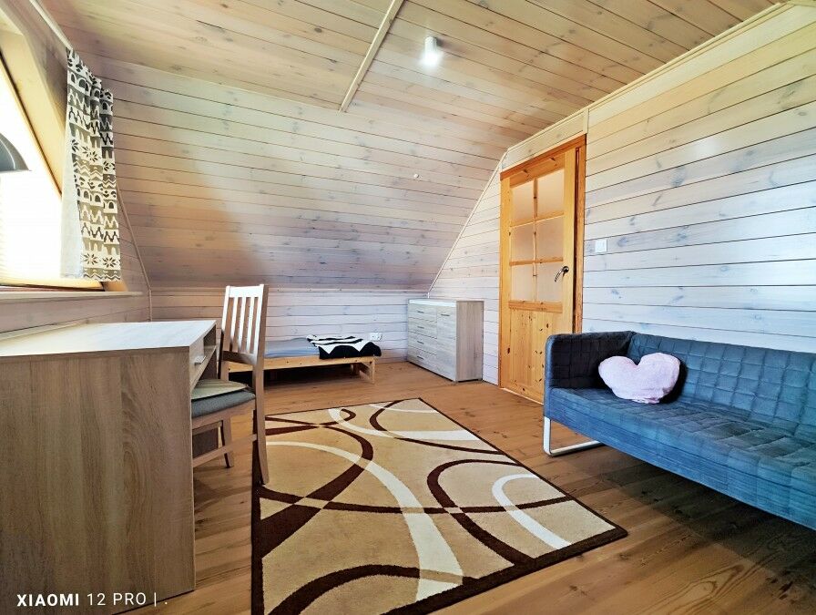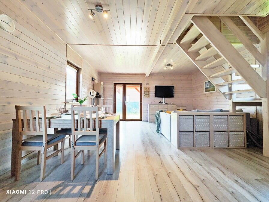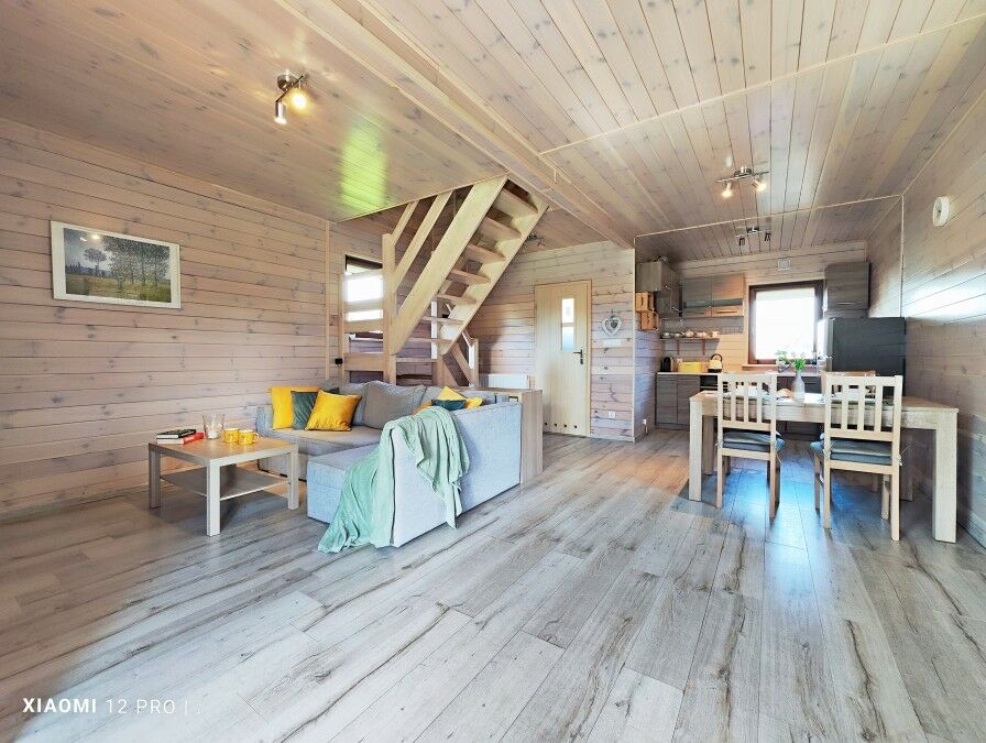 Ściany w całym domku drewniane w jasnej tonacji.