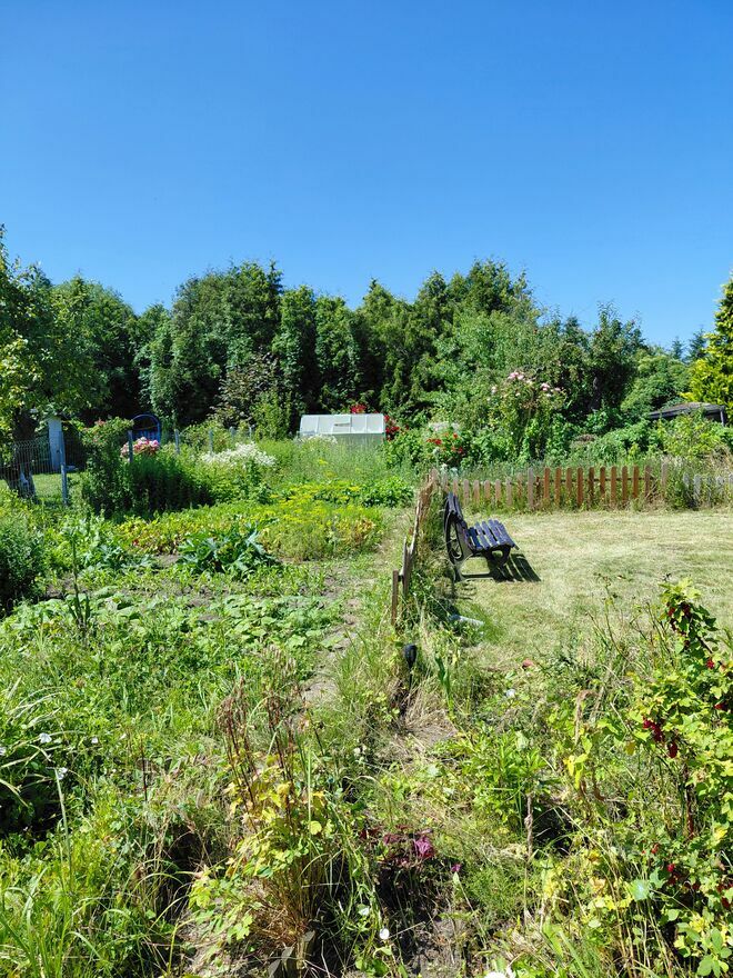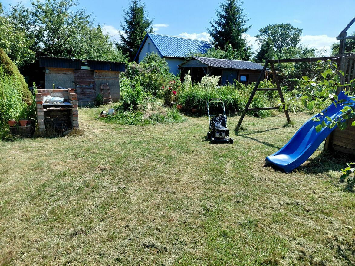 • Działka nr 8 – woda doprowadzona, stara szopa na narzędzia, domek dla dzieci z zabawkami, zjeżdżalnia i huśtawki.