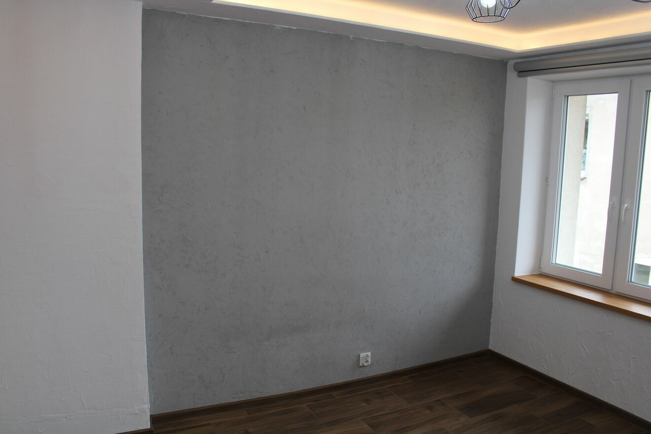 ściany wykończone gładziami i tynkami dekoracyjnymi.