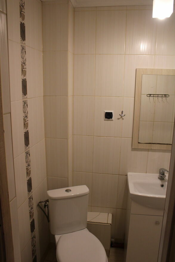 łazienka z niedużą wanną, WC oraz umywalką,